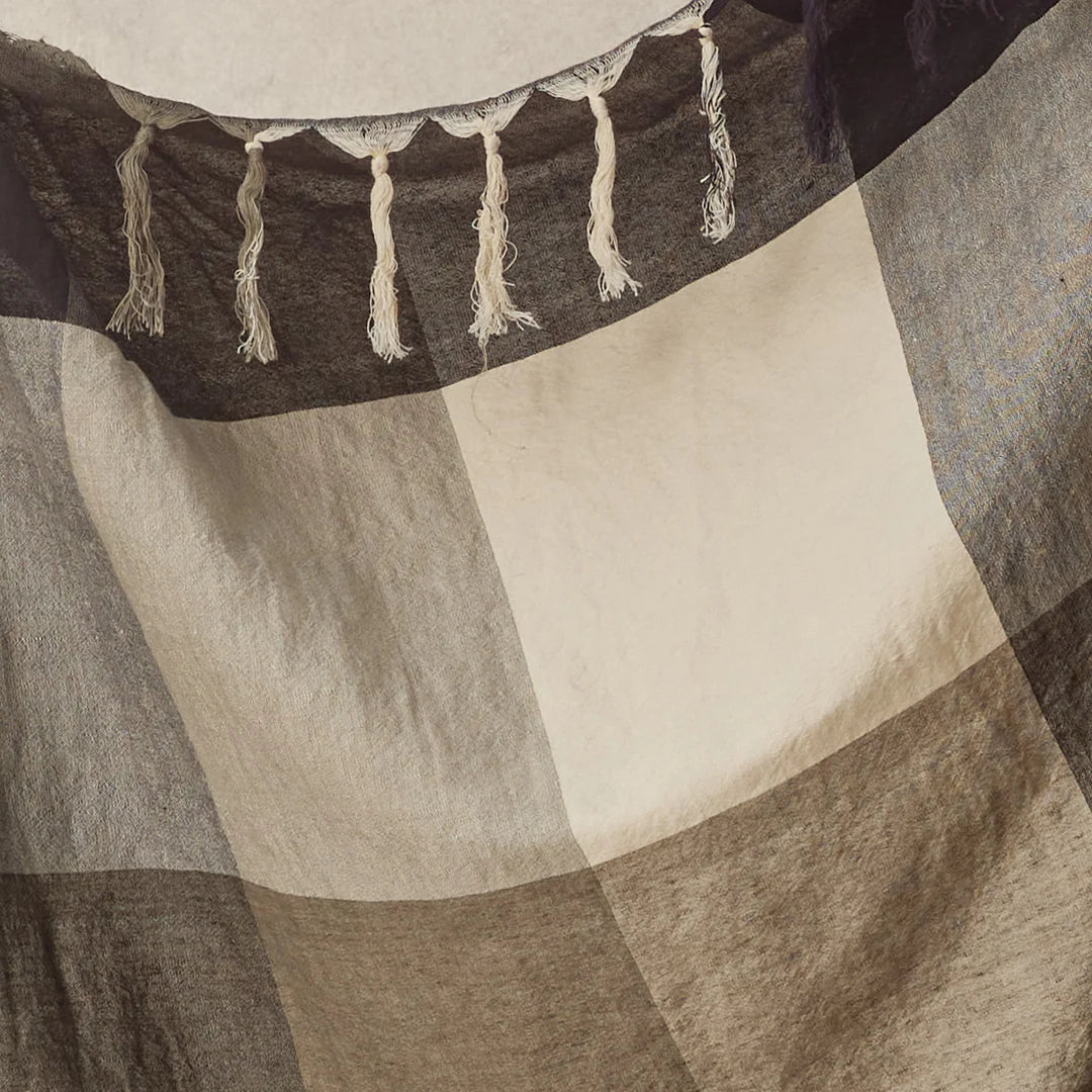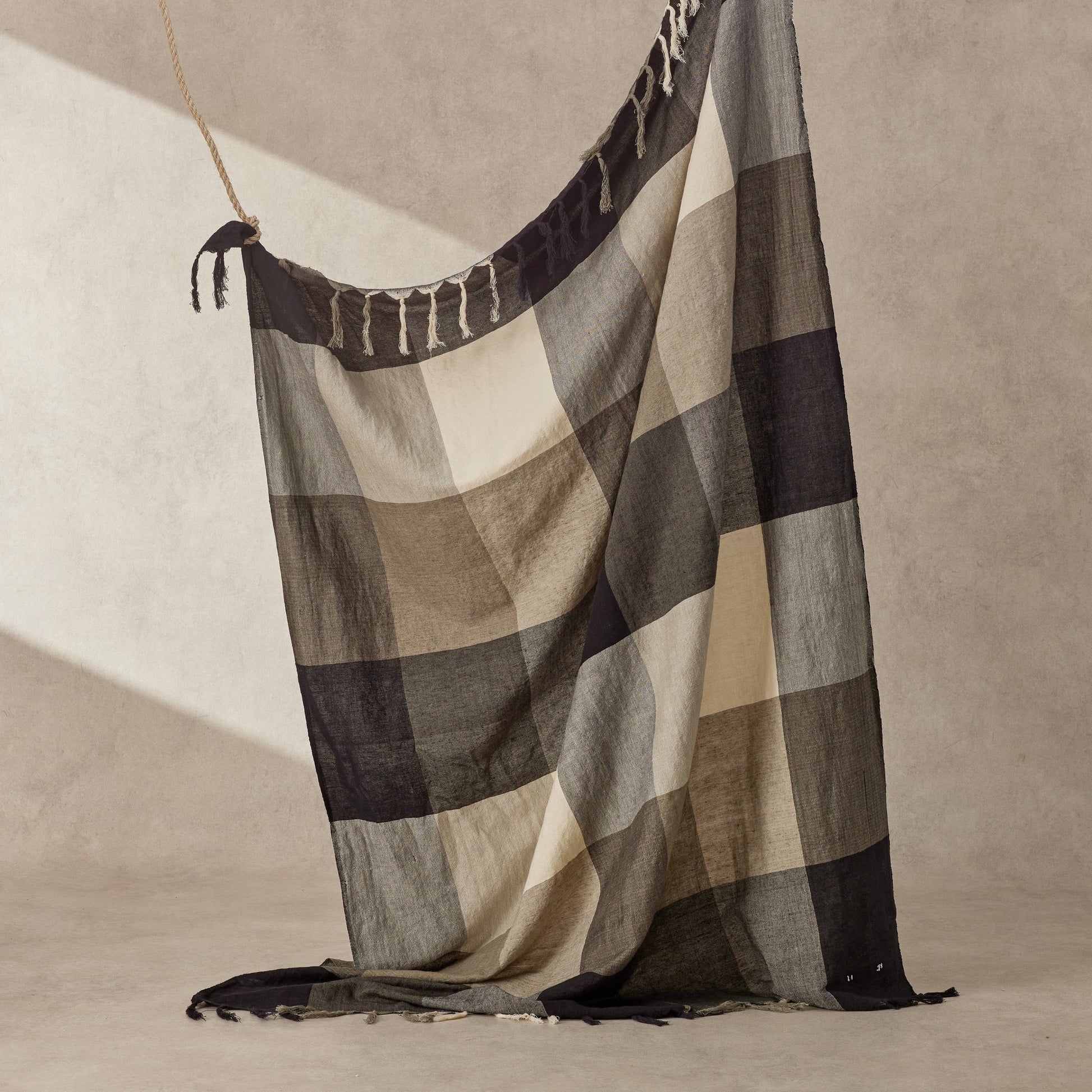 Add depth and visual interest to any space with the Harriet Throw. The perfect lightweight and versatile blanket, this throw showcases a modern take on a traditional multi-coloured check pattern making it a perfect accent for both traditional and modern interiors. This exquisite linen-style throw is meticulously crafted from a luxurious linen cotton blend, combining the softness of cotton with the timeless appeal and quality of linen. The Harriet Throw is adorned with hand-knotted fringes, enhancing its artisanal charm. The fringes not only serve as an elegant detail but also provide a tactile element that invites cozy moments of relaxation. Available in four stunning on-trend hues including Eggplant (brown, maroon, white hues), Marshmallow (light brown hues), Moss (cool green hues) and Coal (black and blue hues).