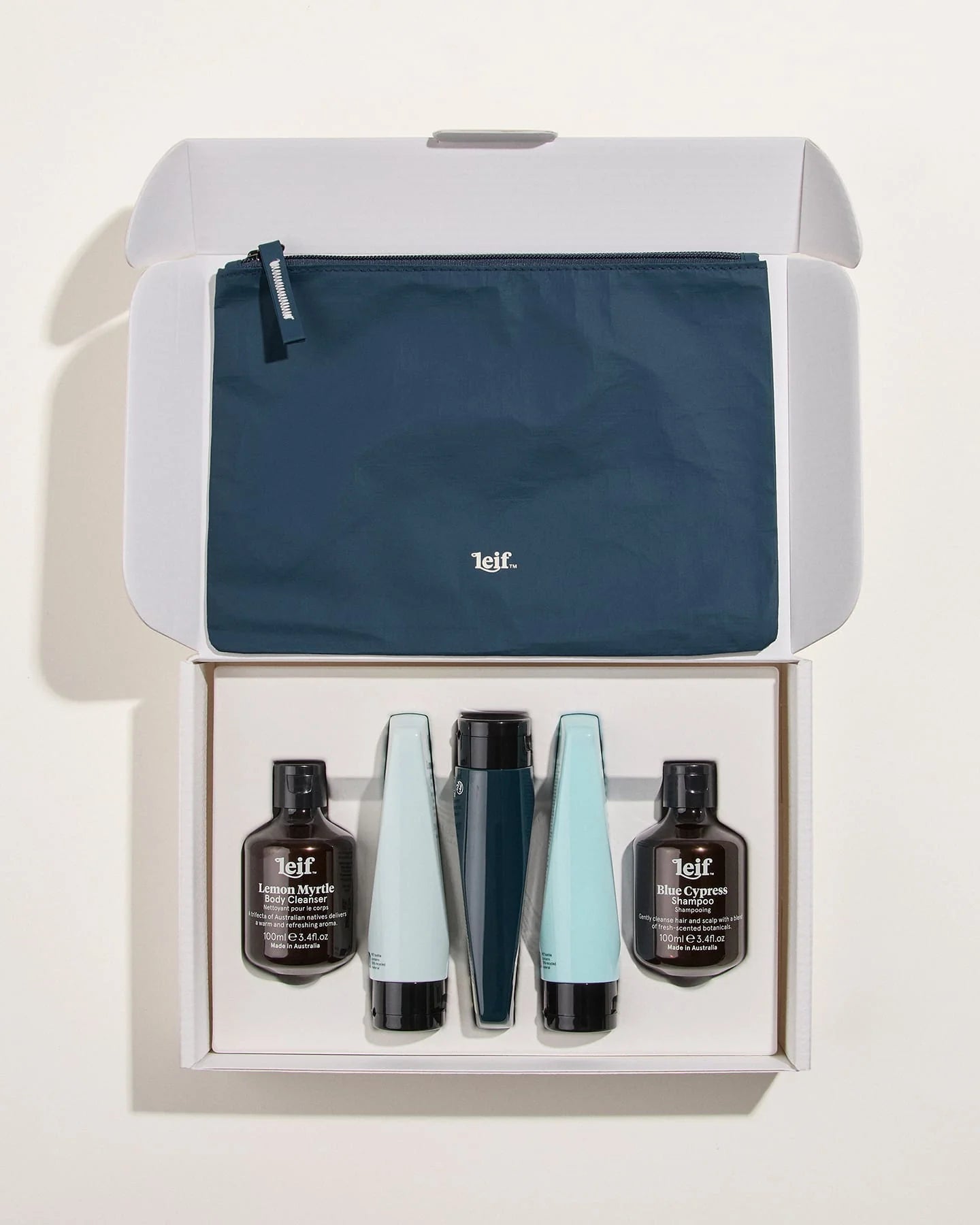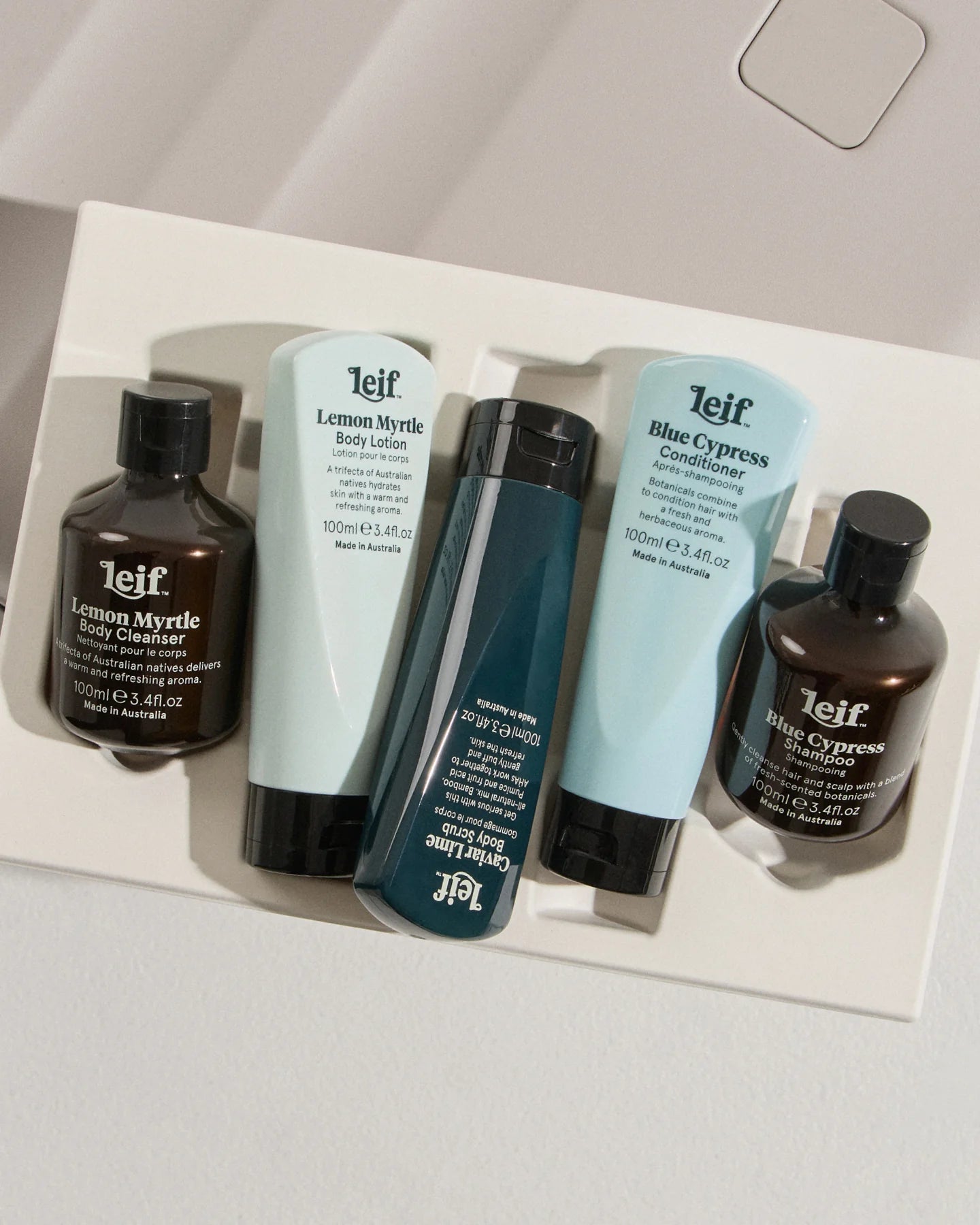 Five mini products for hair and body to explore — big enough for an extended stay, small enough to carry-on. Lemon Myrtle Body Cleanser & Lotion, Caviar Lime Body Scrub and Blue Cypress Shampoo & Conditioner come complete with a water-resistant bag to keep it all together.