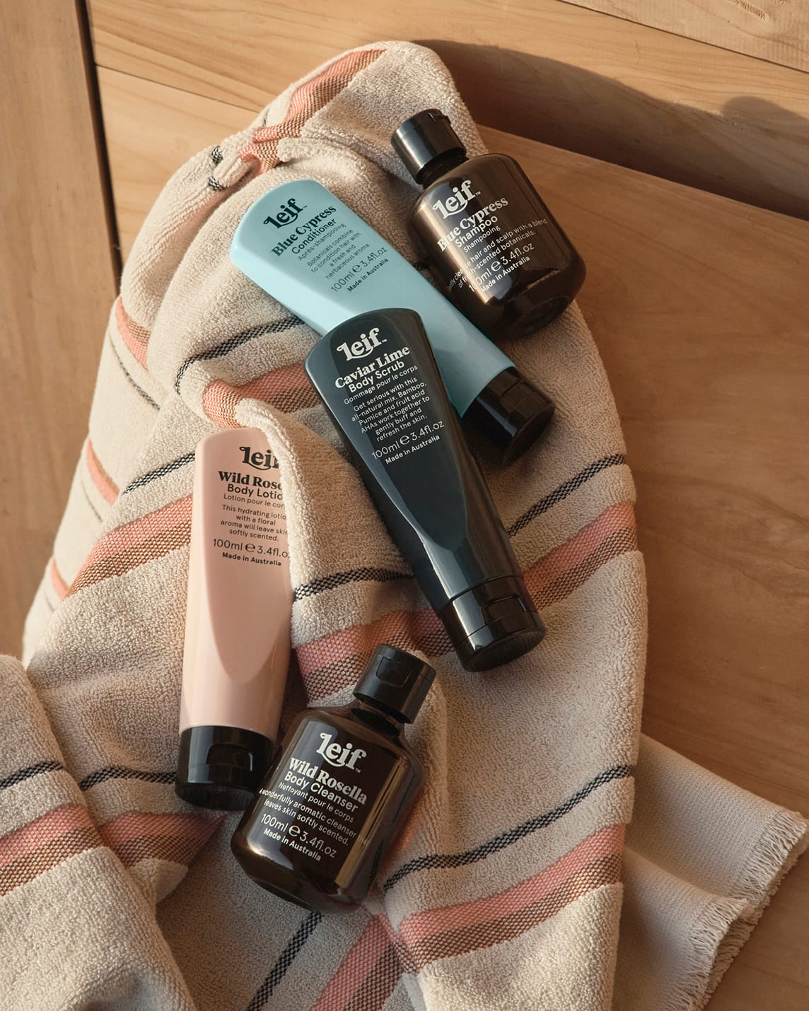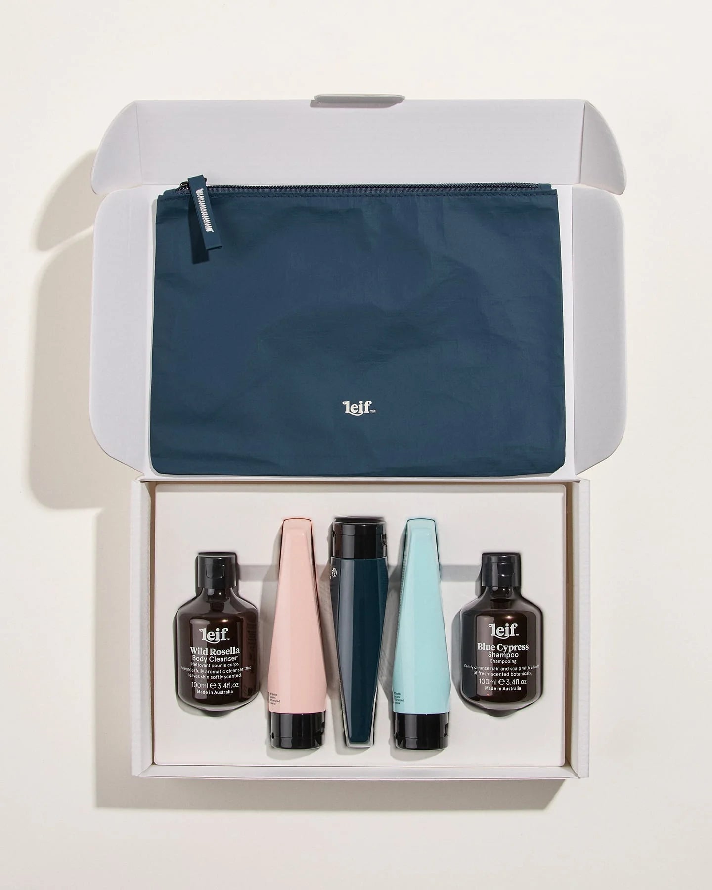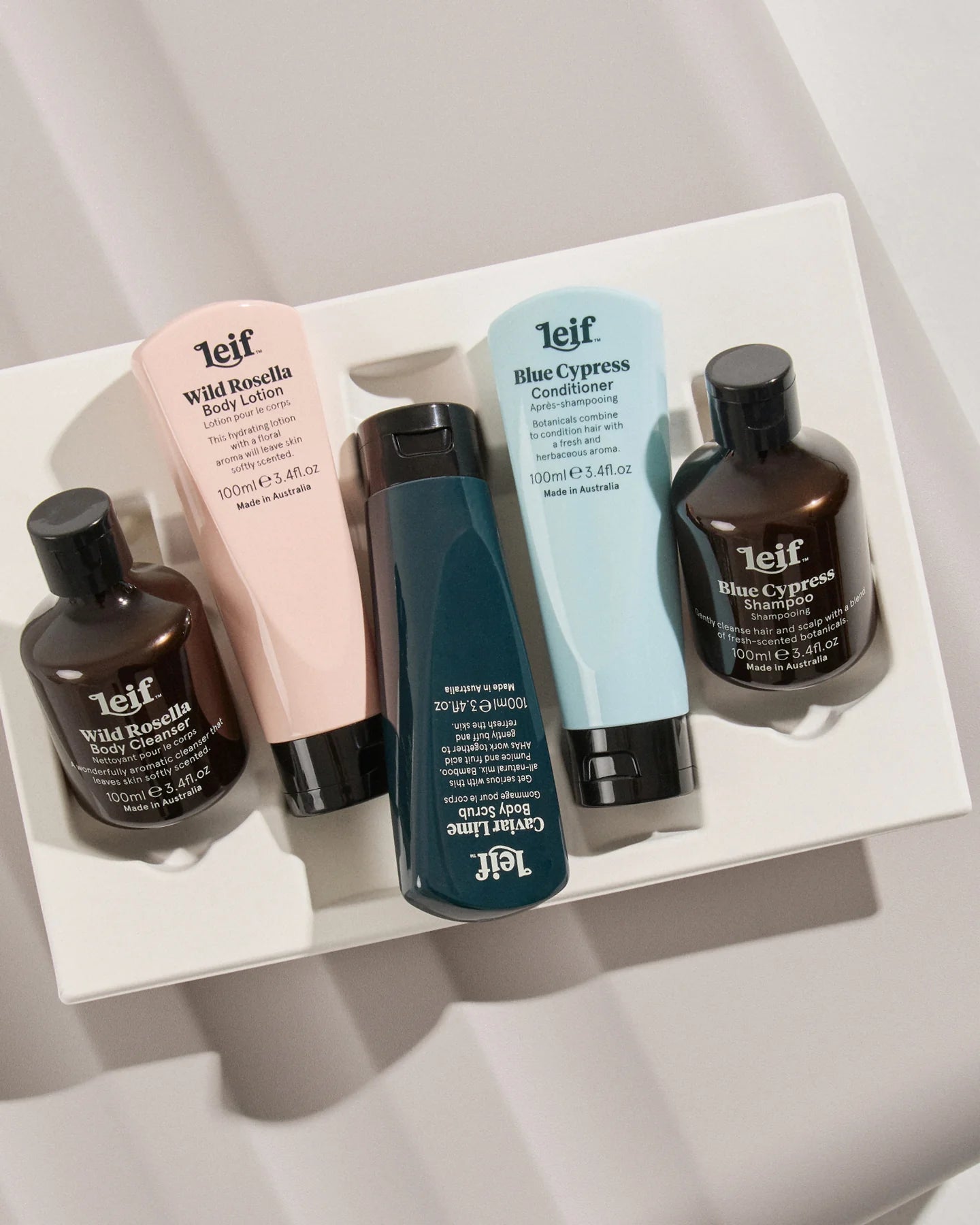 Five mini products for hair and body to explore — big enough for an extended stay, small enough to carry-on. Wild Rosella Body Cleanser & Lotion, Caviar Lime Body Scrub and Blue Cypress Shampoo & Conditioner come complete with a water-resistant bag to keep it all together.